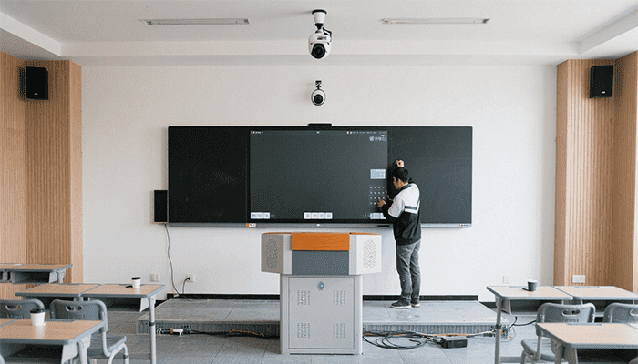地面铺防静电地板,避免设备受干扰;墙面贴吸音棉,减少回声保证音响效果;投影幕布安装在黑板对面,高度与学生视线平齐(底边距地面1.2米),周围避免强光直射;讲台设多媒体控制台,预留网线、HDMI接口,配备散热风扇,防止设备过热死机。