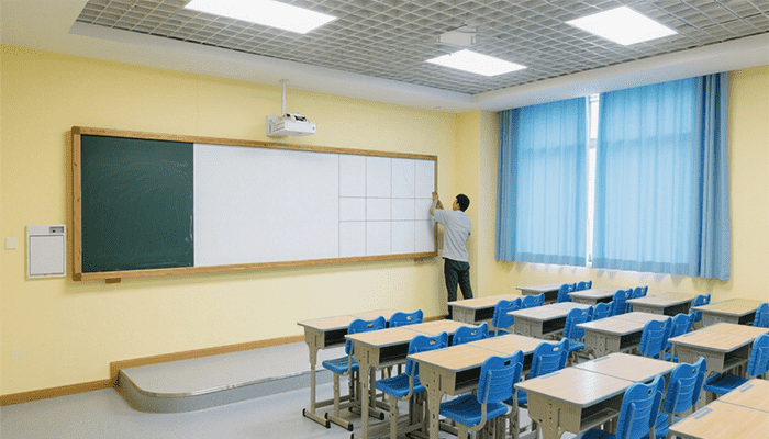 优先利用自然光,窗户面积与地面面积比不低于1:5,窗帘选浅色系半遮光款,避免强光直射黑板;黑板上方装专用护眼灯(照度≥500lux),均匀照亮板面无反光;教室顶部装LED格栅灯,色温4000K(暖白光),照度≥300lux,每2㎡设1盏灯,避免光线明暗不均。黑板选用墨绿色哑光材质,减少镜面反射对眼睛的刺激。