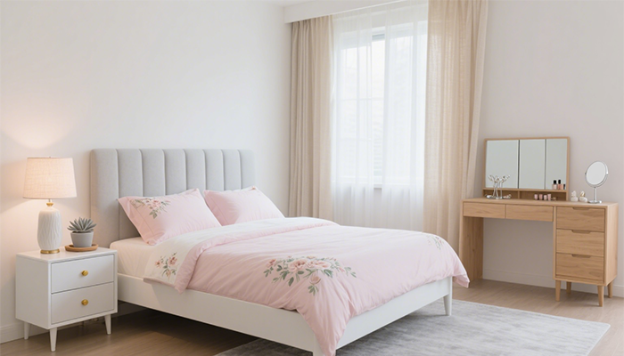 衣柜选浅色系肤感PET门板(米白、浅灰),表面光滑如肌肤,指纹、灰尘不易附着,用干布一擦即净,柜体板材选E1级浅木色颗粒板,整体色调统一;床架选浅灰色科技布或米白色亚麻布材质,科技布防水防污(可乐洒上不渗透),亚麻布纹理细腻显高级,避免选亮面烤漆(易留指纹)和纯白色布艺(易发黄难清洗);床头柜选浅木色实木贴皮或浅灰哑光板材,边角做圆角处理,表面无复杂雕花,简洁更显干净。