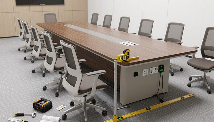 空间布局:会议桌尺寸适配参会人数(10人桌长≥2.4米,20人桌长≥4米),桌椅间距≥0.8米(方便进出),椅子靠背角度舒适(久坐无酸痛),椅轮滑动顺畅(无卡顿);若设主席台,主席台与听众区高度差≥0.3米,视线无遮挡(听众能看清主席台)。