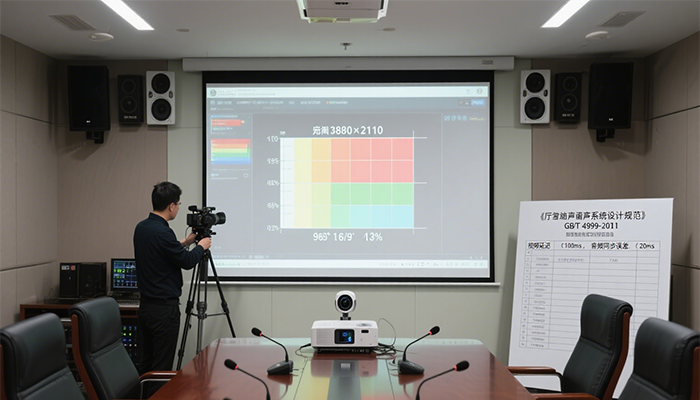影音设备:投影/显示屏画面清晰(无反光、模糊),投射范围覆盖整个会议桌(参会者均能看清),焦距、色彩调节正常;音响系统音质清晰(无杂音、电流声),麦克风(手持+头戴式)收音灵敏(后排参会者说话,前排能清晰听见),无断连现象;视频会议设备(摄像头、麦克风)角度适配(覆盖所有参会位置),通话时无卡顿、延迟(网络测试下载速度≥100Mbps)。