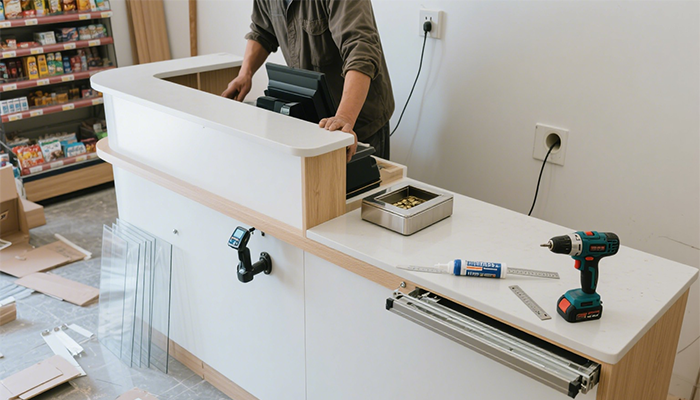 不忽视“收银台布局”:收银台选“L型”或“一字型”(宽度≤1.2米,避免占空间),且紧邻出口(方便顾客结账离开),台面上预留扫码枪、计算器位置,台下做抽屉(放零钱、票据),不将收银台设在店深处(顾客结账绕路,降低效率)。