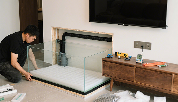 承重安全:鱼缸注满水后重量大(1L水约1kg,60L鱼缸总重超80kg),需放在承重能力强的家具上(如实木鱼缸柜、金属支架,承重≥150kg),避免放在普通茶几、电视柜上(易塌陷);若放地面,需确认地面平整(误差≤2mm),且远离走动频繁的通道,防止碰撞。