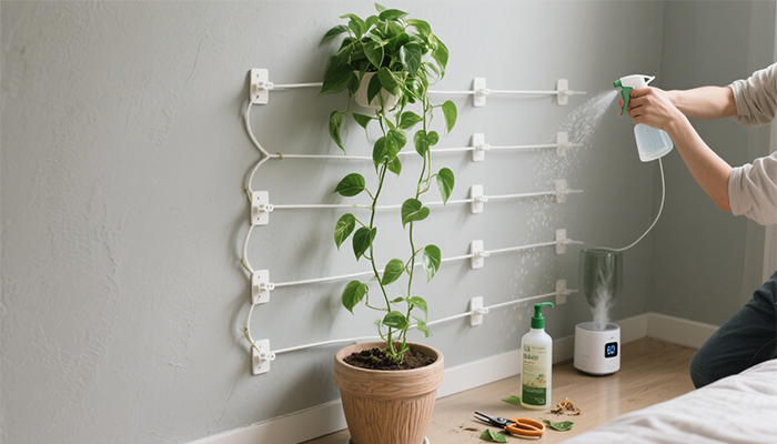 日常养护要点:浇水遵循“见干见湿”(如绿萝土面下2cm干燥后再浇水,多肉盆土完全干透后再浇水),避免浇水过多导致烂根、发霉;定期修剪黄叶、枯叶(保持绿植整洁,减少细菌滋生);每月转动一次花盆(让绿植均匀受光,避免叶片偏向一侧生长)。