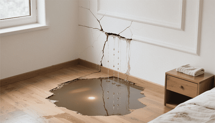 卫生间/厨房上方漏水:大概率是楼上防水层破损(如shower区防水失效)、水管破裂(如暗管老化、接口松动),或楼上地漏堵塞导致积水渗透;