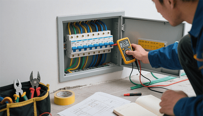 单路合闸测试:先合上总断路器,再逐一合上分路断路器(每次只合1路,间隔3-5秒),若某一路合闸后立即跳闸,说明该回路存在问题(如插座回路、空调回路);