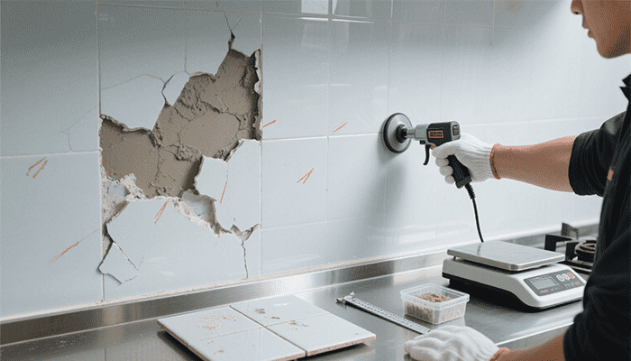 ①拆除破损瓷砖:用美工刀沿瓷砖缝隙划开,再用扁凿从边缘插入,轻轻敲凿拆除(避免损坏周边瓷砖,若周边瓷砖松动需一并检查);