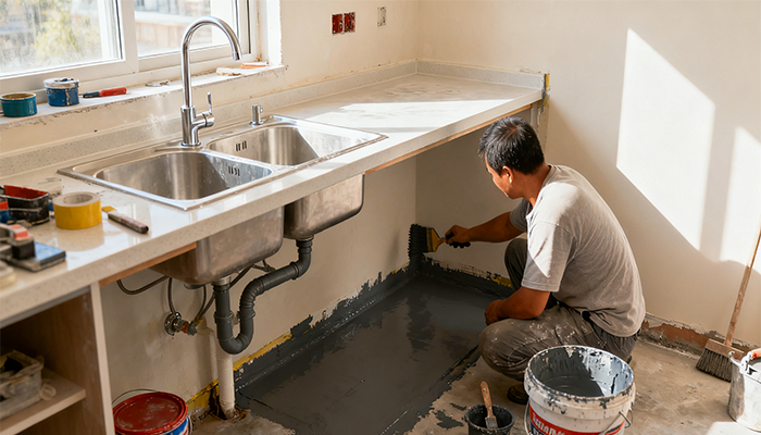 防水施工完成后需养护48小时(确保涂层干透),再进行闭水试验:地面蓄水深度≥2cm,用挡水条围合核心区域,标记水位线;24小时内观察水位是否下降,同时联系楼下查看天花板(重点看厨房对应位置),无滴水、水印则合格;若渗漏需标记渗漏点,补刷防水后重新试验。