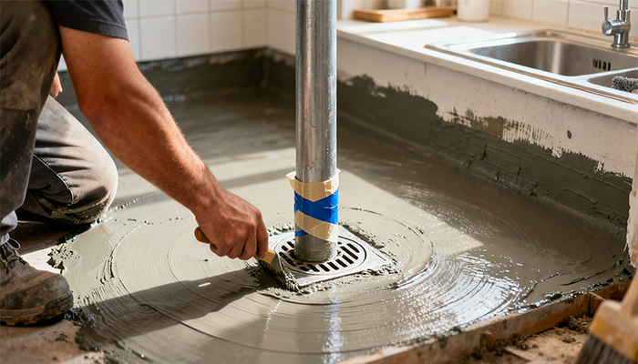 铲除地面、墙面空鼓层与浮灰,用水泥砂浆修补裂缝(裂缝宽度>2mm时需贴抗裂绷带);墙面、地面含水率需≤8%(可用湿度仪检测),若基层潮湿需通风干燥后再施工,避免防水涂层起鼓脱落;水槽、管道洞口需用堵漏王填充密实,洞口周边20cm范围刷2遍防水。