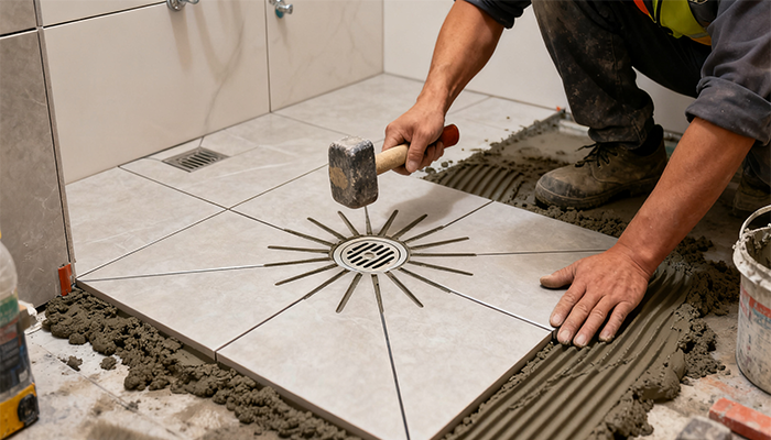 瓷砖对准位置铺贴,用橡皮锤轻敲压实(确保与周边瓷砖平齐,误差≤1mm),留2-3mm缝隙(方便美缝),24小时内禁止踩踏,3天后用防霉美缝剂填缝(卫生间潮湿,需选防水防霉款)。